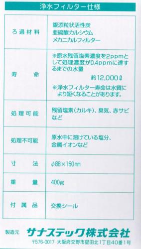 | 特徴 | レベラックJrIIシリーズに標準装備の高機能タイプ。水道管から溶けた鉛も除去。ろ過材の種類:抗菌活性炭 亜硫酸カルシウム 鉛除去活性炭。 |