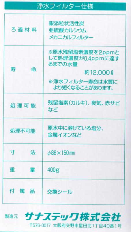| 特徴 | レベラックシリーズに標準装備の高機能タイプ。水道管から溶けた鉛も除去。ろ過材の種類:抗菌活性炭 亜硫酸カルシウム 鉛除去活性炭。 |